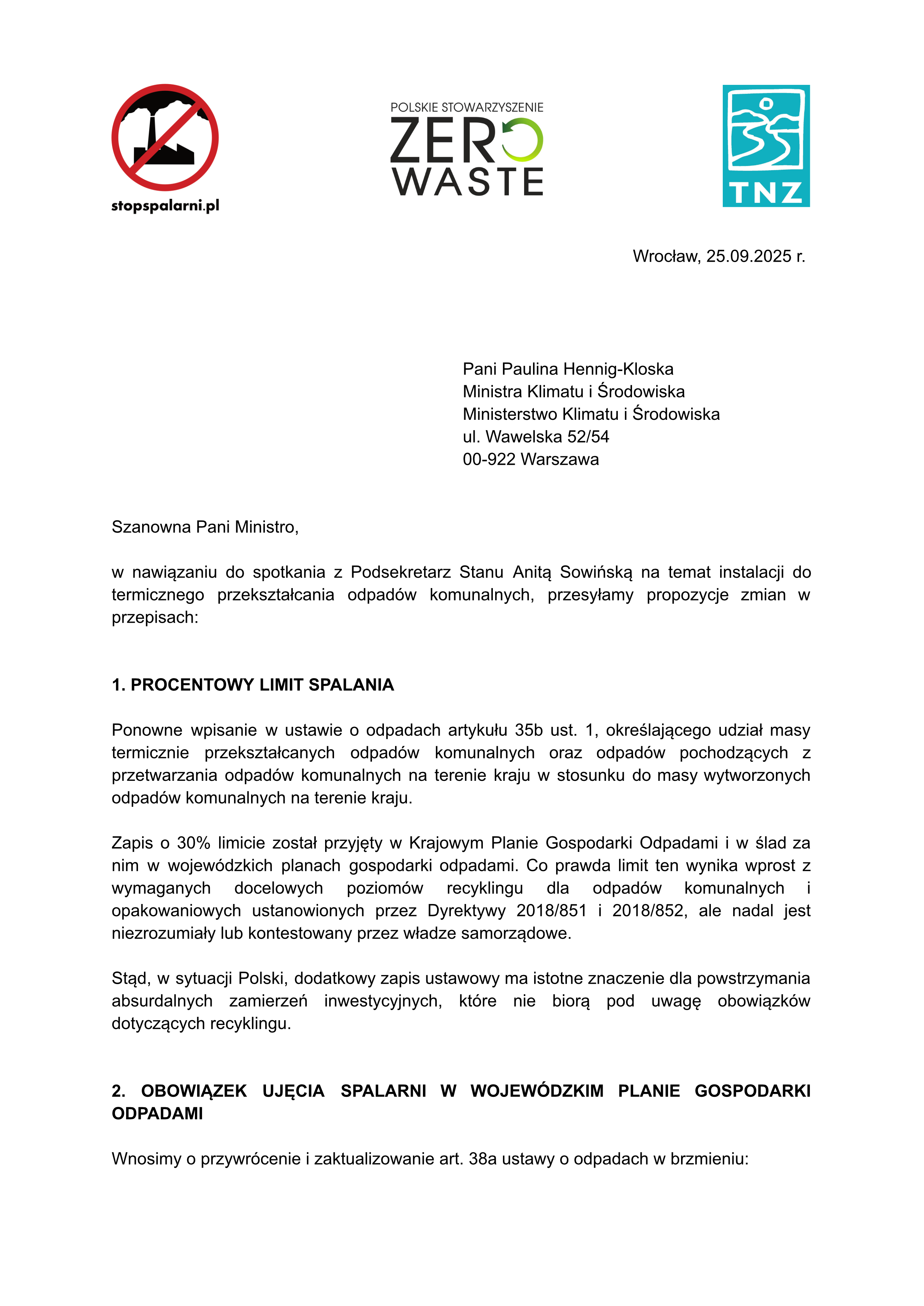 W ślad za spotkaniem z Panią Anita Sowińska Sekretarz Stanu Ministerstwo Klimatu i Środowiska skierowaliśmy propozycje zmian w przepisach dotyczących instalacji termicznego przekształcania odpadów komunalnych.